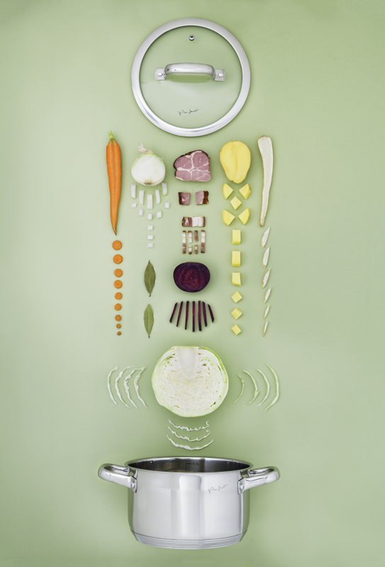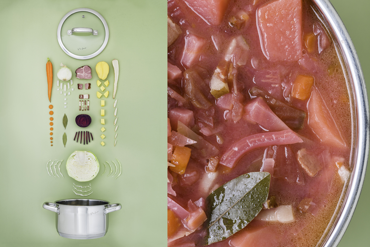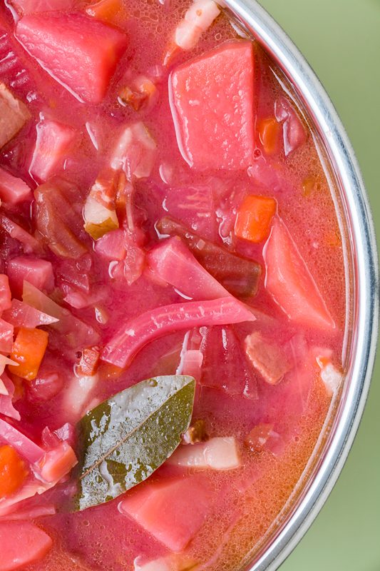 Zalijeme hovězím vývarem, který jsme si před tím připravili uvařením hovězího masa na polévku a přivedeme k varu. Poté přidáme na kostičky nakrájené brambory, nakrájené hovězí a vepřové maso, na kostičky nakrájenou a opečenou slaninu, na nudličky nakrájené zelí. Osolíme a opepříme a poté přidáme červenou řepu, kterou jsme si předem uvařili zvlášť ve slupce a oloupali, nakrájenou na kostičky nebo nastrouhanou na hrubším struhadle.