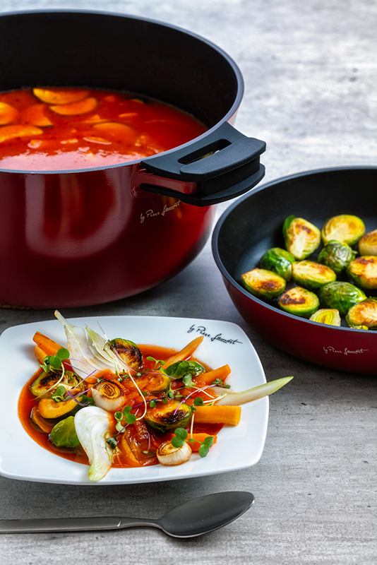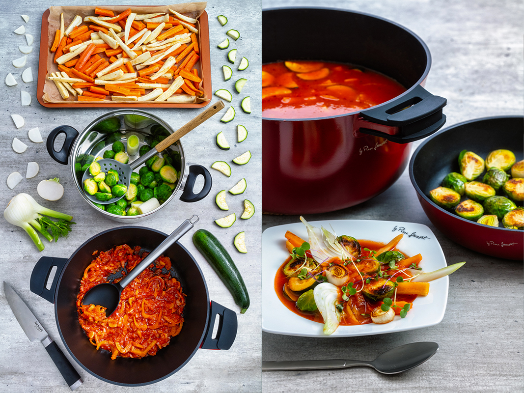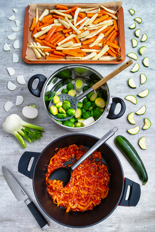 Ve větším hrnci rozpálíme olej a krátce orestujeme nadrobno nakrájenou cibulku, jeden nakrájený fenykl a na plátky nakrájené stroužky česneku. Přidáme rajčatový protlak, podlijeme vínem a necháme vydusit. Poté vsypeme drcená rajčata, vlijeme zeleninový vývar, osolíme, opepříme a necháme také přejít varem. Do tohoto základu pak postupně přidáme zeleninu – nejprve na klínky nakrájenou syrovou řepu, krátce nato předpečenou mrkev s petrželí a na závěr na kolečka nakrájenou cuketu. Vaříme cca 30 minut.