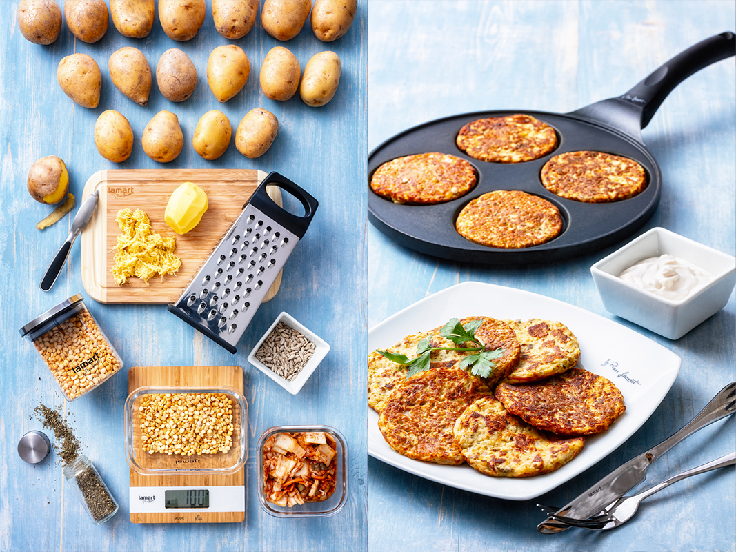 Kimči můžeme vyměnit za kyselé zelí. Přidáním žlutého hrachu, kimči nebo kyselého zelí dodáme bramboráčkům zajímavé pikantnosti, a taky zlepšíme nutriční hodnoty.