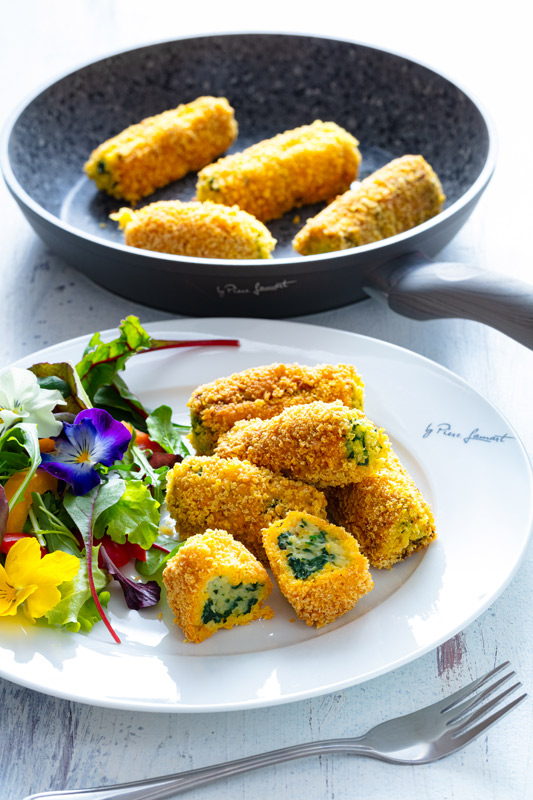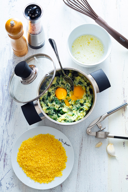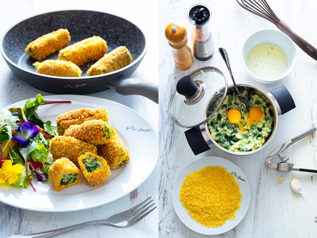 Bramborovou kaší dochutíme solí a pepřem (pokud je potřeba) a smícháme ji se žloutky a špenátem. Pomocí polevkové lžíce odkrájíme kousky bramborového těsta a rukama z něj vytváříme podlouhlé krokety. Hotové krokety obalíme v rozšlehaných bílcích a ve strouhance.