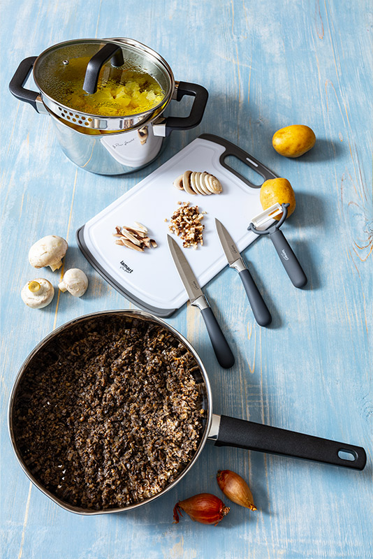Mezitím si připravíme nádivku, a to tak, že nejprve nasucho očistíme žampiony (v žádném případě neomýváme!) a odkrojíme měkké části. Vytvoříme drobné kostičky 2–3 mm, vložíme je do papírové utěrky a hodně silně vymačkáme, abychom odstranili co nejvíce tekutiny, kterou houby obsahují. Šalotku oloupeme, nasekáme také nadrobno a orestujeme v horkém oleji, až zesklovatí. Přisypeme vymačkané houby a restujeme za stálého míchání při střední teplotě asi 5 minut. Směs odstavíme z ohně, ochutíme solí, pepřem, muškátovým oříškem a citronovou šťávou a necháme vychladnout. Opláchneme petrželku, osušíme ji, nasekáme nadrobno a vmícháme ji do žampionové nádivky.