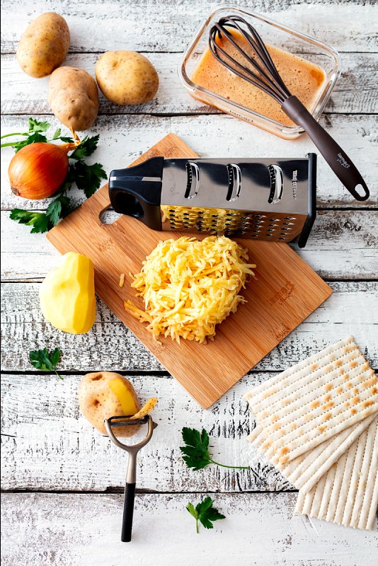 V míse promícháme nastrouhané brambory a cibulí, vejce rozšleháme se solí a pepřem. Tyto dvě směsi důkladně promícháme, přidáme nasekanou petržel a zahustíme strouhankou.