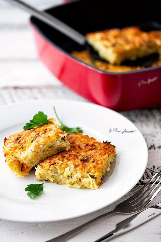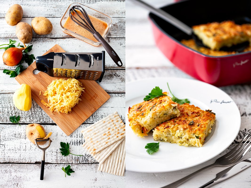 Troubu předehřejeme na 190 °C. Do formy nebo pekáčku nalijeme olej. Brambory oloupeme, nastrouháme nahrubo a na cedníku pořádně propláchneme pod tekoucí vodou a poté je důkladně vymačkáme. Cibule očistíme a nastrouháme, listy petrželky nasekáme.
