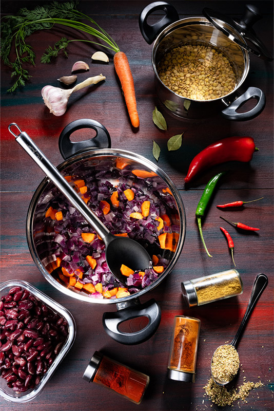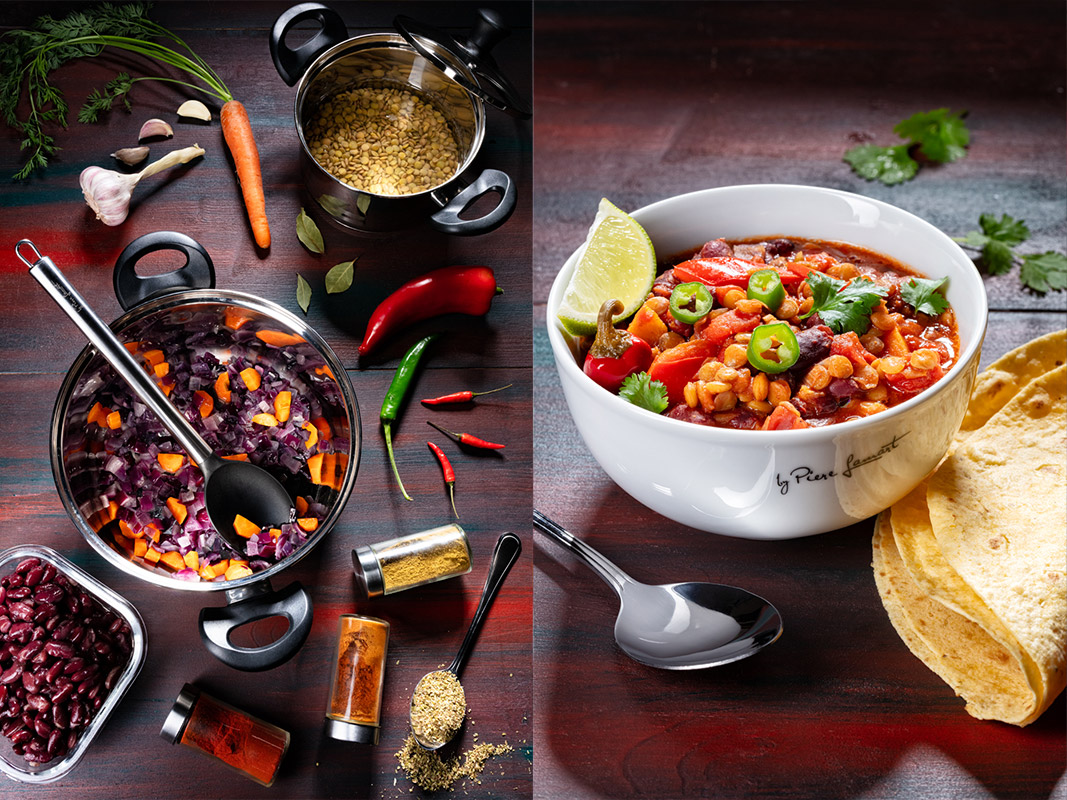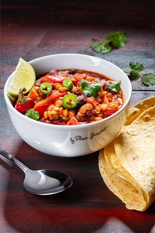 Čočku vložíme do hrnce se studenou vodou a necháme 2–3 hodiny namáčet – ještě lepší je nechat ji ve vodě den předem a v chladu. Nahrubo nakrájenou cibuli vhodíme do většího hrnce nebo velké pánve s rozehřátým olejem a restujeme 2 minuty. Přidáme na větší kostky nakrájenou mrkev s kapií a restujeme dalších 7 minut. Postupně přidáme nasekanou feferonku, nadrobno nasekaný česnek, římský kmín, chilli koření, rajčatový protlak a uzenou papriku, přičemž každou surovinu po přidání krátce orestujeme, než přidáme další. Celou směs poté zalijeme 800 ml vlažné vody, přidáme scezenou a propláchnutou čočku, bobkový list, osolíme a zvolna vaříme 15 minut, dokud čočka nezačne měknout. Pak přidáme rajčata a scezené fazole a dalších 10 minut společně povaříme. Následně zakápneme limetou, vmícháme oregano a dle potřeby dochutíme solí.