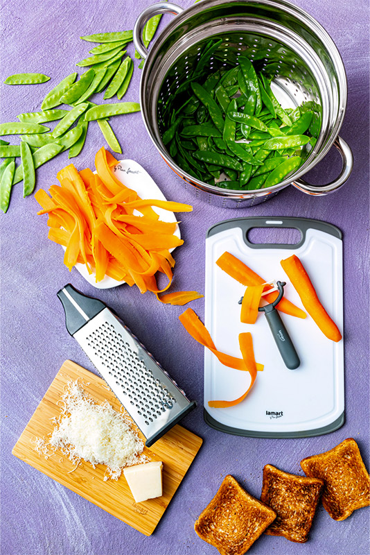 Mrkev oloupeme, vložíme do vroucí vody a vaříme 3 minuty od bodu varu. Následně slijeme vodu, necháme zeleninu zchladnout a pak ji nakrájíme na hoblinky pomoci škrabky na brambory nebo struhadla na zeleninu.