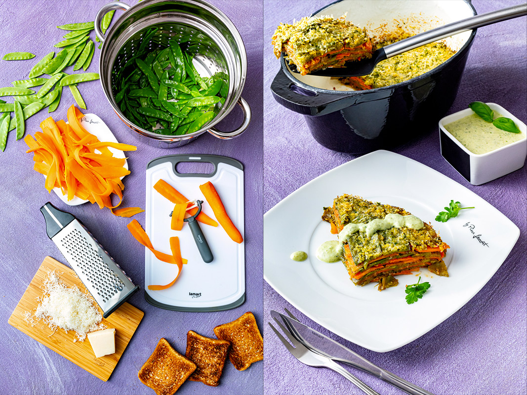 Zapékací formu vymažeme máslem a dno vyložíme jednou vrstvou hráškových lusků. Posypeme bylinkovou strouhankou a navrstvíme mrkev, kterou rovněž posypeme bylinkovou strouhankou. Střídavě vrstvíme lusky, strouhanku a mrkev. Zakončíme strouhankou, na kterou rozdělíme hoblinky másla, vložíme do trouby a pečeme 20 minut.
