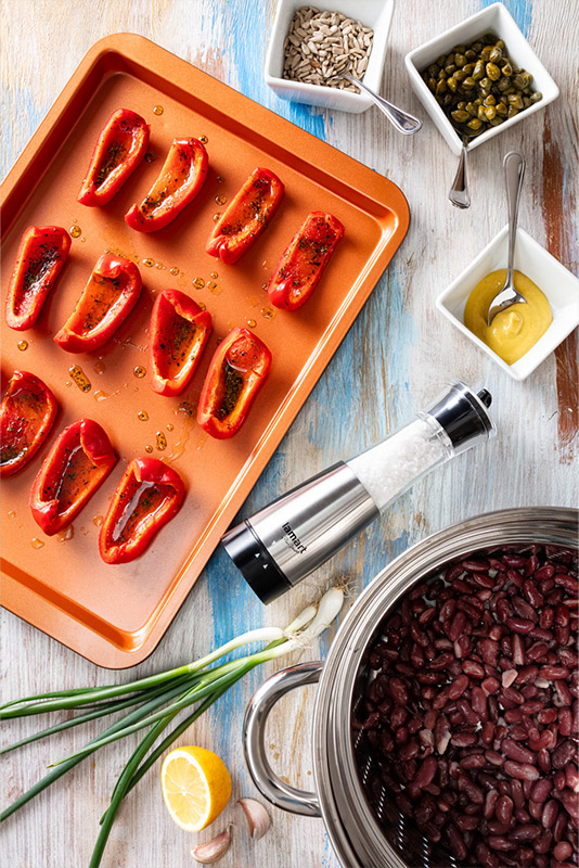 Zapneme a předehřejeme troubu na 170 °C. Papriky zbavíme semínek, nakrájíme na větší kousky, zalijeme olivovým olejem, osolíme, posypeme provensálskými bylinkami a pečeme cca 25 minut do zlatova. Poté je necháme vychladnout. Do mi×eru vložíme scezené a propláchnuté fazole, vychlazené papriky, slunečnicová semínka, oloupaný česnek, hořčici, citronovou šťávu a rozmi×ujeme. Směs přemístíme do misky, vsypeme najemno nakrájenou jarní cibulku a kapary, zakapeme dvěma lžícemi olivového oleje a promícháme.