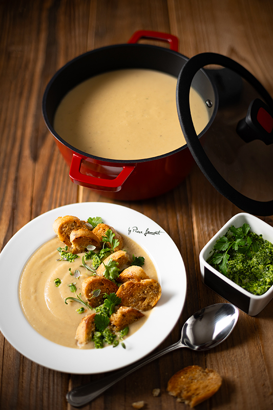 Polevku rozdělíme do talířů, do každého kápneme trochu pesta, posypeme krutony a bylinkami a podáváme.