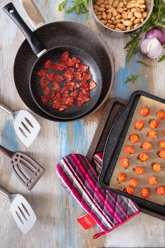Fazole slijeme z konzervy a propláchneme. Na oleji si opečeme chorizo salám překrájený na čtvrtky. Salám vyjmeme a necháme okapat. Na stejném oleji v pánvi opečeme na proužky nakrájenou červenou cibuli, kterou po opečení zakápneme balsamicovým octem a přidáme lžíci medu. Lehce povaříme a osolíme.