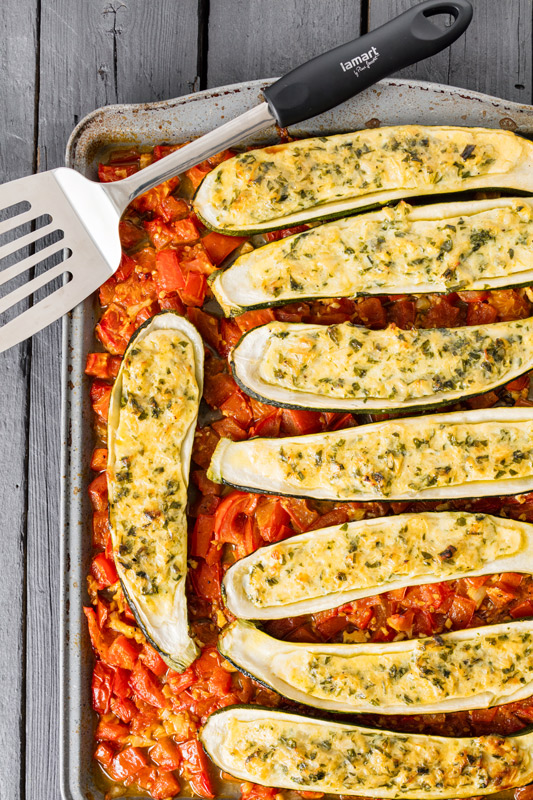 Cuketky podélně rozkrojíme a lžící vydlabeme všechnu jemnou dužinu se semínky. Vydlabané cukety pokapeme olivovým olejem, naskládáme na plech a pečeme v troubě na 180°C cca 10 minut. Poté vyndáme a dáme stranou.