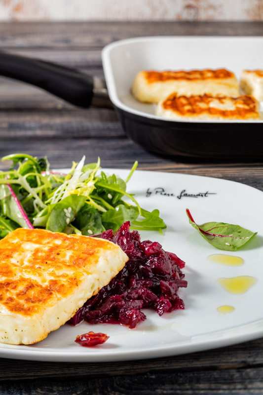 Řecký sýr Halloumi nakrájíme na stejnoměrné plátky, lehce opepříme a grilujeme na rozpálené pánvi na olivovém oleji z obou stran do zezlátnutí.