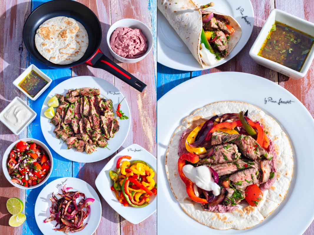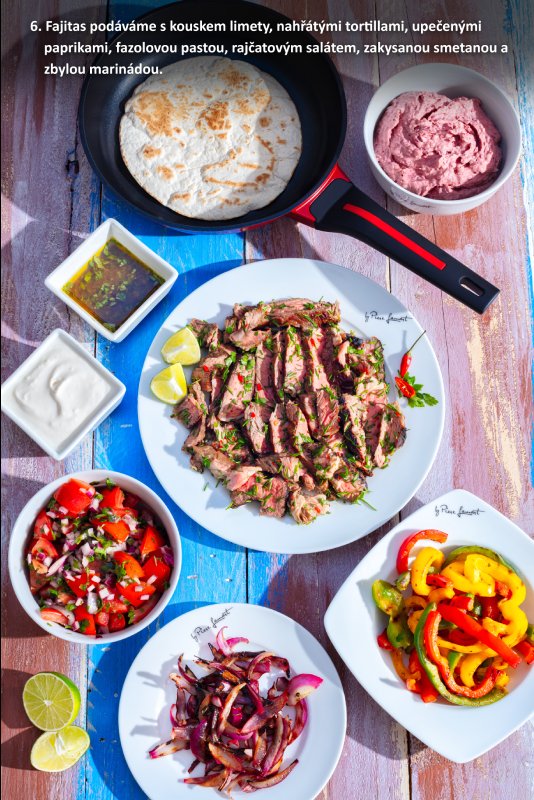 Fajitas podáváme s kouskem limety, nahřátými tortillami, upečenými paprikami, fazolovou pastou, rajčatovým salátem, zakysanou smetanou a zbylou marinádou.