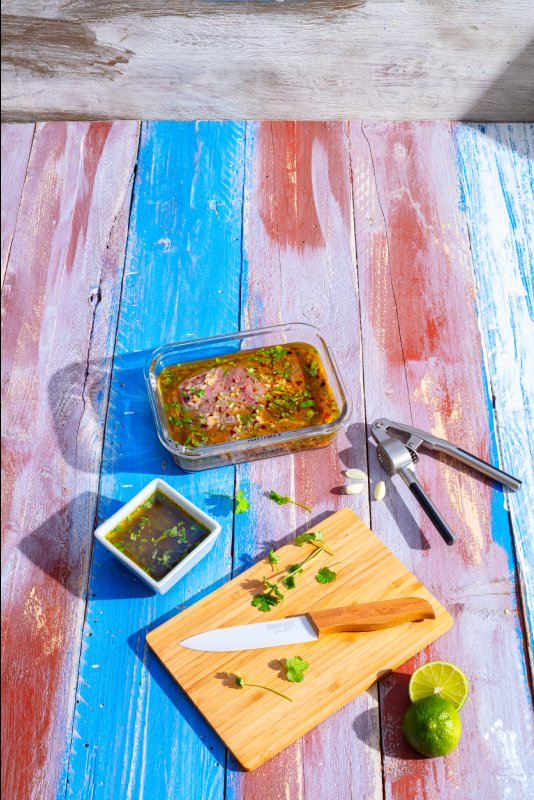 Smícháme 150 ml oleje, šťávu ze 3 limet, 1 hrst koriandrových lístků, rozmělněný česnek, chilli vločky, římský kmín, cukr, sůl a pepř. Promícháme a polovinu marinády odlijeme do jiné nádoby. Do zbývající naložíme maso a necháme odležet (nejlépe přes noc).