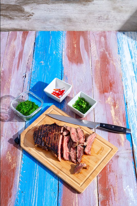 Steak nakrájíme na plátky, posypeme nasekaným koriandrem, chilli papričkou a pažitkou.