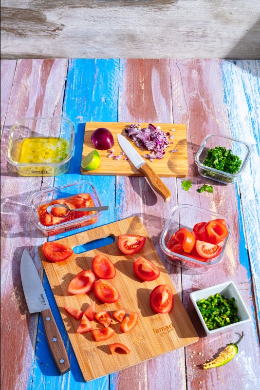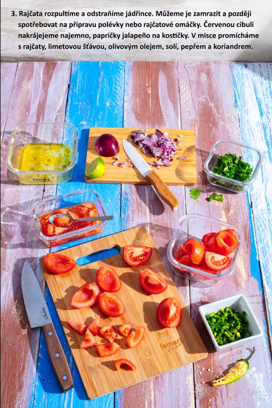 Do salátu rozpůlíme rajčata a odstraníme jádřince, které můžeme zamrazit, abychom je nemuseli vyhazovat, a později je spotřebovat na přípravu polévky nebo rajčatové omáčky. Červenou cibuli nakrájíme najemno a papričky jalapeño na kostičky. V misce promícháme s rajčaty, limetkovou šťávou, olivovým olejem, solí, pepřem a koriandrem.