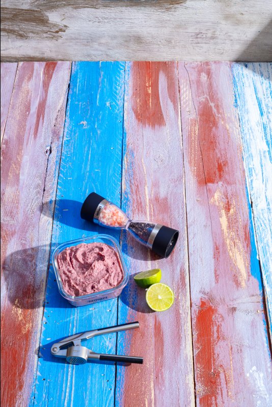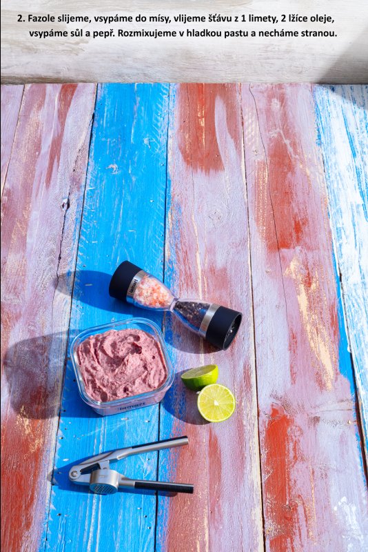 Fazole slijeme ze sklenice, vsypeme do mísy, přilijeme šťávu z 1 limety, přidáme 2 lžíce oleje a vsypeme sůl a pepř. Rozmixujeme v hladkou pastu a odložíme stranou.