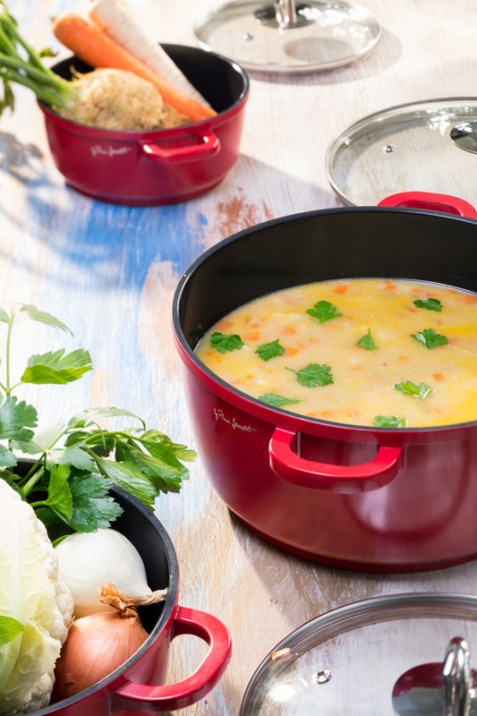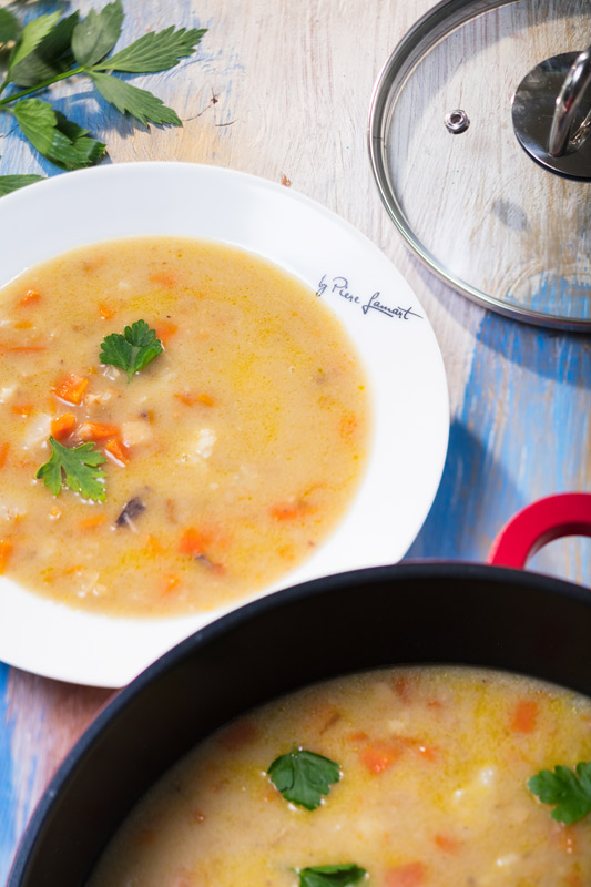 Do polévky při servírování můžeme přidat vařené široké nudle a posypat sekanou petrželkou.
