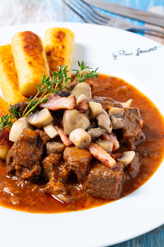 Víno necháme odvařit a poté zalijeme maso vodou nebo vývarem, přidáme bobkový list, nasekaný tymián a dusíme do měkka. Když je maso tak z poloviny měkké, přidáme na nudličky nakrájenou slaninu a ke konci vaření zahustíme nastrouhaným starším chlebem.