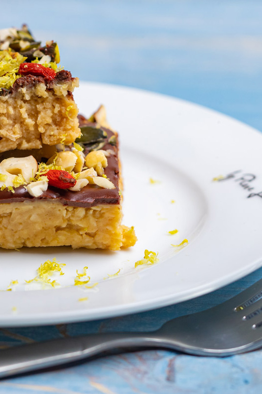 Poté vmícháme cukr a vaříme další 2 minuty. Odstavíme z plotny, přidáme kokosový olej, strouhaný kokos, kůru a šťávu z citronu a vše důkladně promícháme. Těsto nalijeme do pekáče, vyloženého pečicím papírem a stěrkou uhladime do roviny. Uložíme na hodinu do chladu.