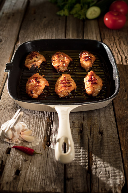 V misce smícháme kečup, ocet, sójovou omáčku, med, olej, nasekaný česnek a zázvor. Osolíme, opepříme a necháme uležet v chladu cca 30 minut. Takto připravenou marinádou zalijeme omytá a osušená křidélka, které jsme zbavili letky a nakrájeli v kloubu na kousky.