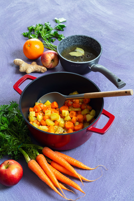 Cibuli očistíme a nakrájíme na kostičky. Zázvor oloupeme a nastrouháme najemno. Bramboru, mrkev a jablko očištěné a zbavené jádřince nakrájíme nahrubo. V hrnci na oleje s máslem zpěníme cibuli a zázvor, přidáme bramboru a jablko, osolíme a opékáme 5 minut, občas promícháme. Zeleninu podlijeme vodou a vaříme 15 minut. Hrnec odstavíme a necháme vychladnout. Do polévky vlijeme vymačkanou pomerančovou št'avu, přidáme med a v mixéru nebo tyčovým míxerom rozmixujeme dohladka.