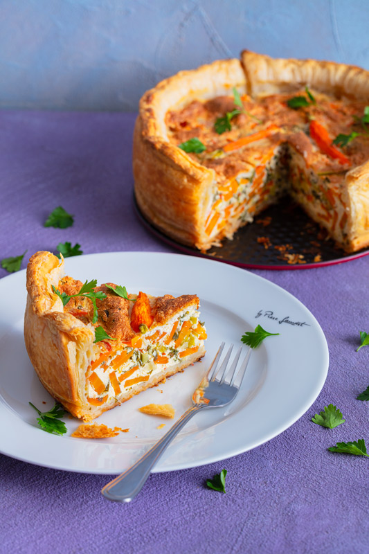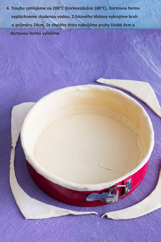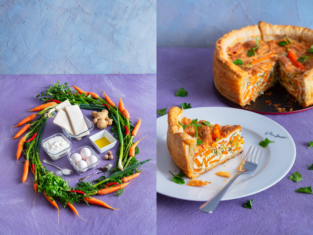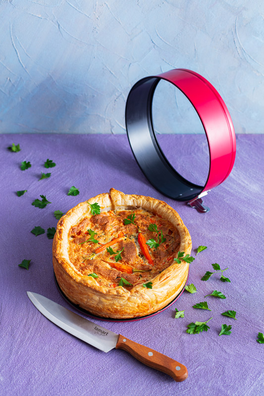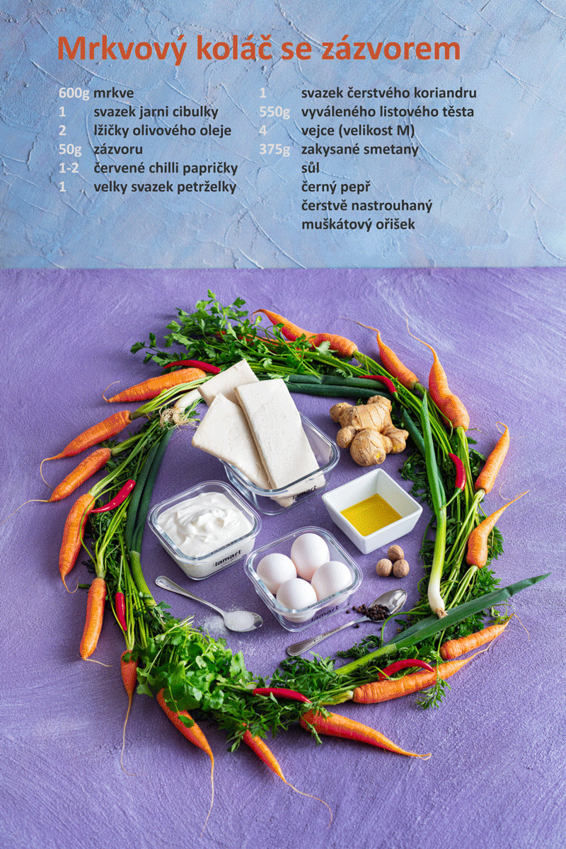 Smícháme mrkev, cibuli, zázvor, chilli a bylinky. Troubu zahřejeme na 200°C (horkovzdušná 180°C). Dortovou formu vypláchneme studenou vodou. Z listového těsta vykrojíme kruh o průměru 24cm. Ze zbylého těsta nakrájíme pruhy široké 4cm a dortovou formu vyložíme.