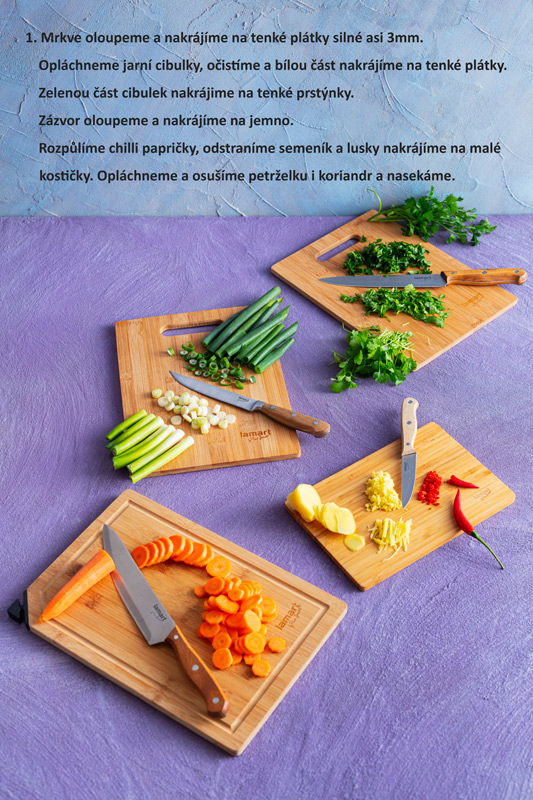 Mrkve oloupeme a nakrájíme na tenké plátky silné asi 3mm. Opláchneme jarní cibulky, očistíme a bílou část nakrájíme na tenké plátky. Zelenou část cibulek nakrájíme na tenké prstýnky. Zázvor oloupeme a nakrájíme na jemno. Rozpůlíme chilli papričky, odstraníme semeník a lusky nakrájíme na malé kostičky. Opláchneme a osušíme petrželku i koriandr a nasekáme.