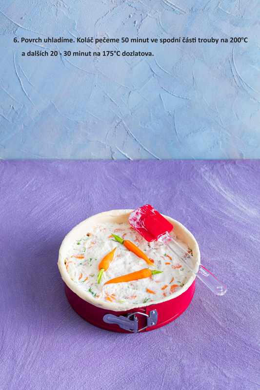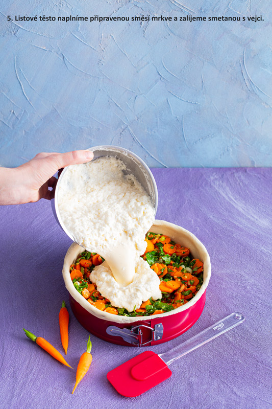 Listové těsto naplníme připravenou směsí mrkve a zalijeme smetanou s vejci. Povrch uhladíme. Koláč pečeme 50 minut ve spodní části trouby na 200°C a dalších 20 - 30 minut na 175°C dozlatova.