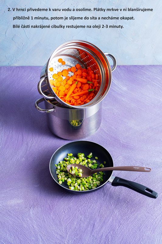 V hrnci přivedeme k varu vodu a osolíme. Plátky mrkve v ní blanšírujeme přibližně 1 minutu, potom je slijeme do síta a necháme okapat. Bílé části nakrájené cibulky restujeme na oleji 2-3 minuty.