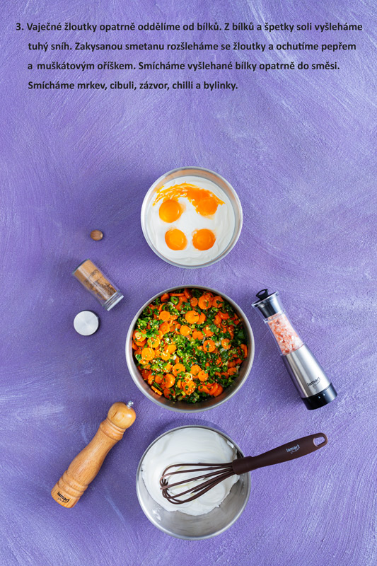 Vaječné žloutky opatrně oddělíme od bílků. Z bílků a špetky soli vyšleháme tuhý sníh. Zakysanou smetanu rozšleháme se žloutky a ochutíme pepřem a muškátovým oříškem. Smícháme vyšlehané bílky opatrně do směsi.
