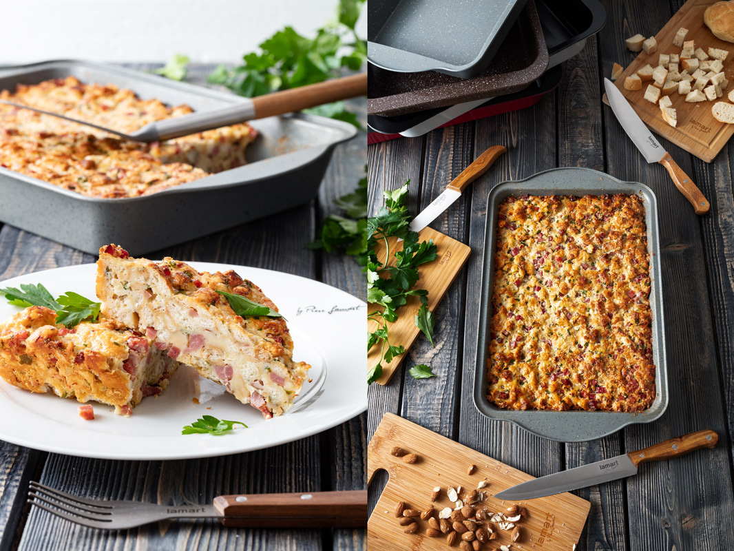 Nádivku rozprostřeme do máslem vymazané formy a pečeme v předehřáté troubě na 190°C cca 30-40 minut do zlatova