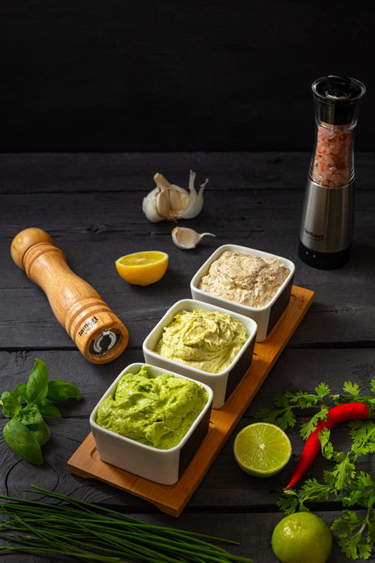 Máslo s limetkou a koriandrem, sardelové máslo s hrubozrnnou hořčicí, bylinkové máslo