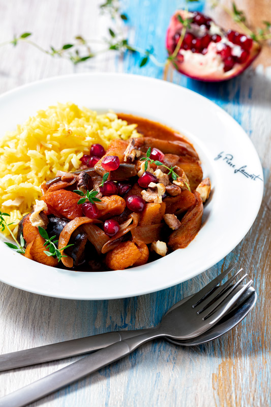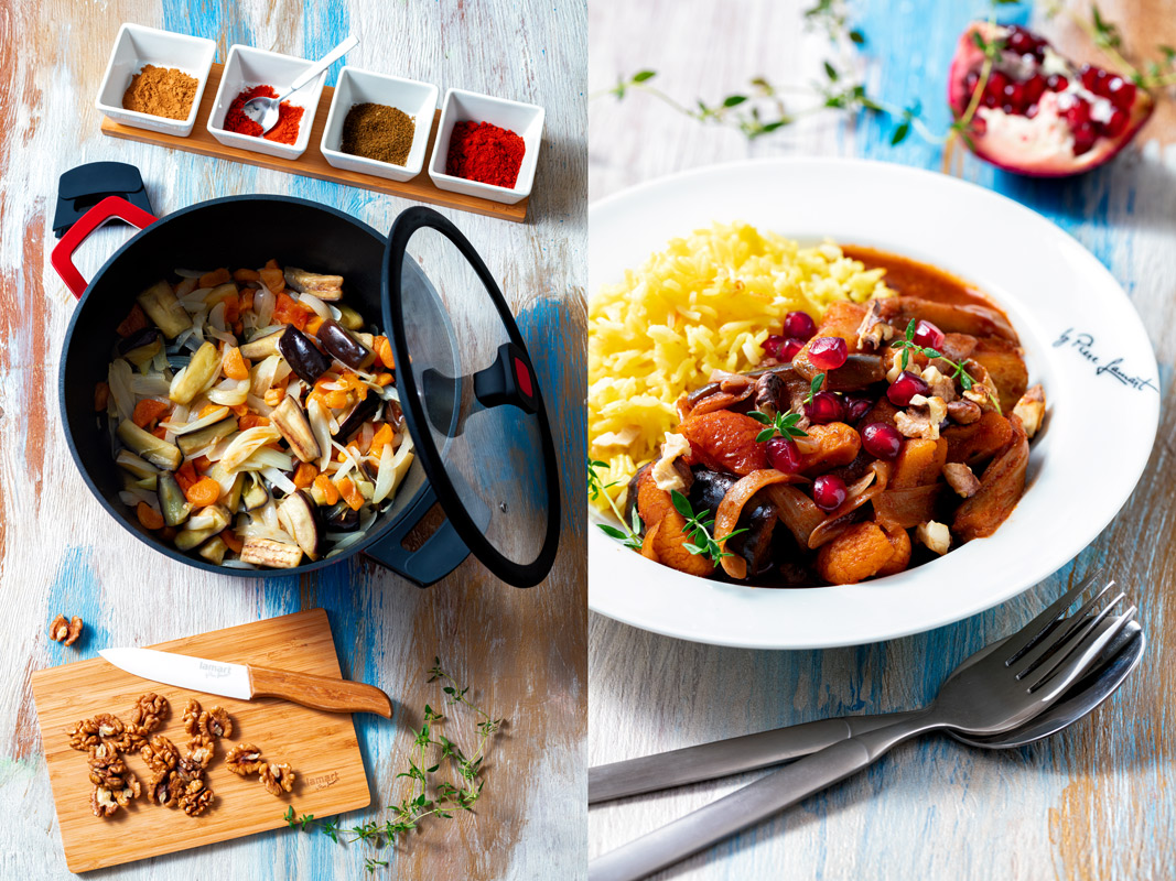 Přidáme vývar, přivedeme k varu, zakryjeme pokličkou a ragú zlehka vaříme při nízké teplotě asi 20 minut, až je všechno měkké. potom vaříme bez pokličky dokud tekutina zhoustné. Ragú ochutíme paprikou, římským kmínem, kajenským pepřem, skořici a sirupem z granátových jablek, dochutíme solí.
