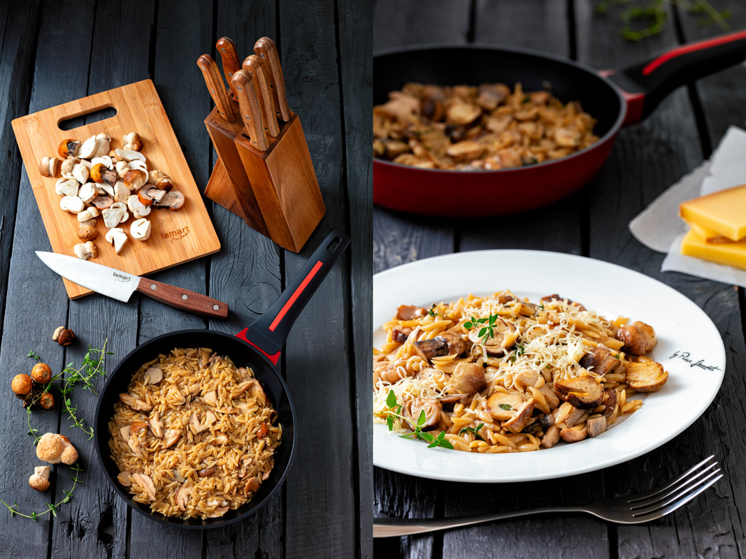 Dodáme těstoviny, zalijeme horkým vývarem a vaříme cca 10 -15 minut. V jiné pánvi zahřejeme zbyly olej a orestujeme na něm rozpůlené hříbky. Posypeme lístky tymiánu, osolíme a opepříme. Pánev sundáme s ohně a vmícháme máslo.