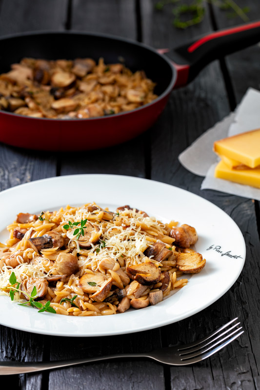 Hotové pastasotto podáváme ihned po uvaření posypané strouhaným sýrem comté.
