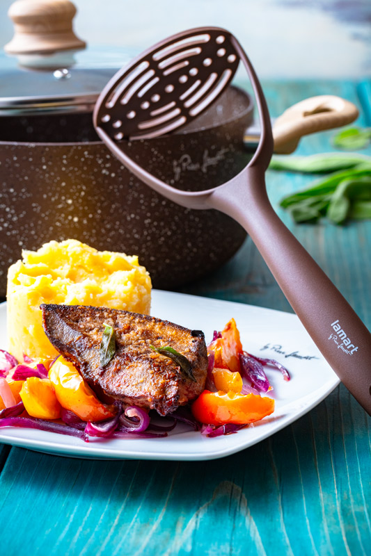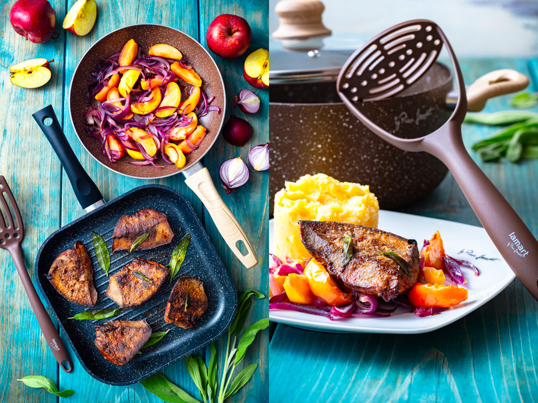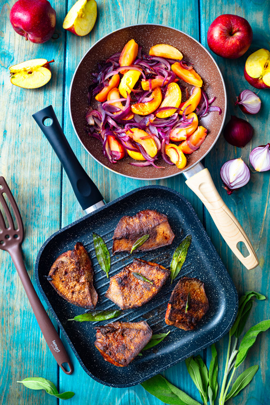 Játra nakrájíme na plátky, poprášíme moukou, opepříme a pečeme v horkém másle se šalvějí po obou stranách cca 3-4 minuty aby byla uvnitř růžová. Necháme po vyjmutí z pánve chvilku na teple odpočinout, osolíme a můžeme servírovat s pyré a dušenými jablky s cibulkou.