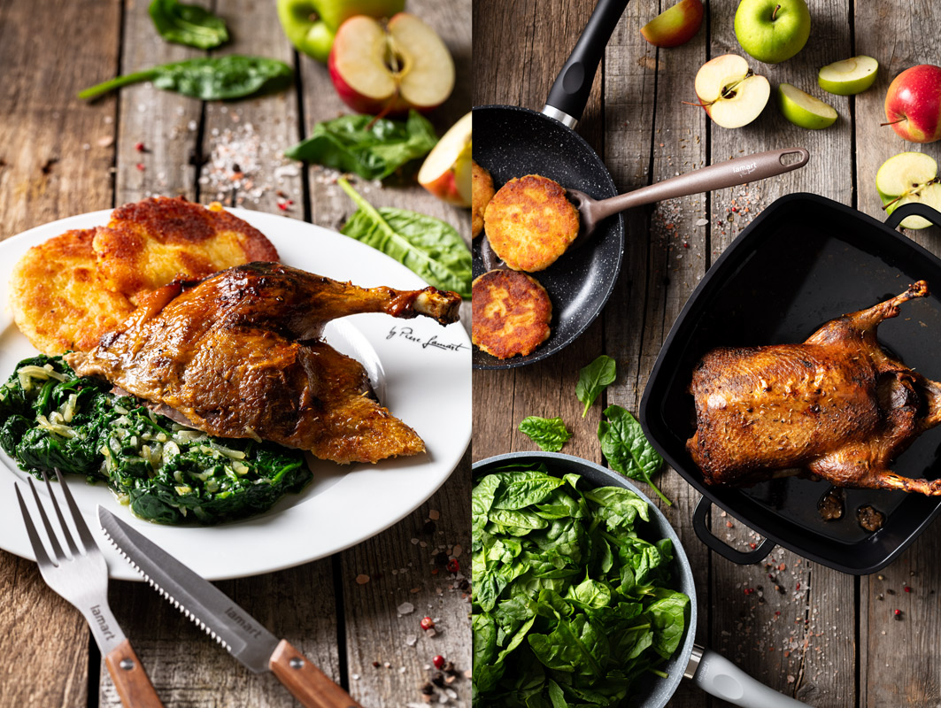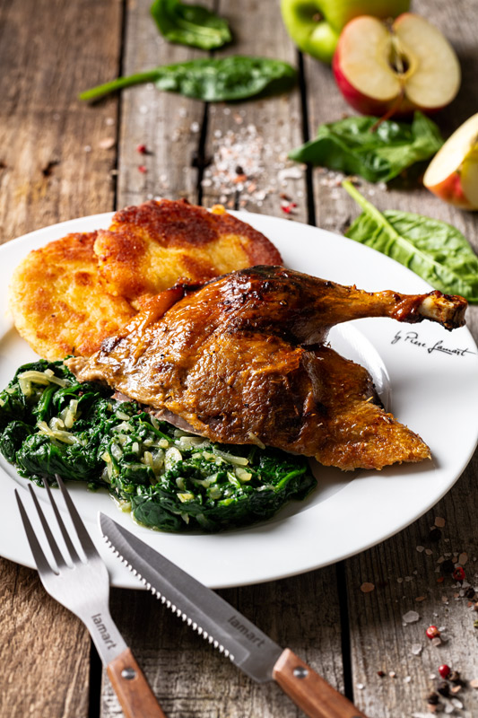 Podáváme opečené škubánky se špenátem a rozkrájenou kachnou, kterou ještě přelijeme výpekem.