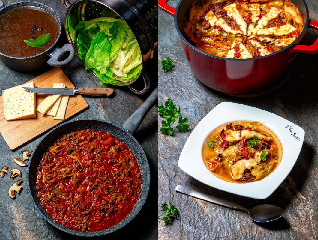 Vývar uvedeme do varu. Nakrájíme cibule na plátky a orestujeme na oleje a kousku másla, jakmile zkřehne, přidáme mleté maso a za stálého míchání opečeme dohněda. Přidáme rajčata, houby i s nálevem a vše podusíme. Mezitím nakrájíme chleba a sýr na plátky. Kapustové listy spaříme ve vroucí vodě. Troubu předehřejeme na 200 °C.