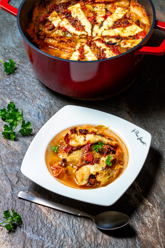Na talíř dáme kus zapečených přísad  a zalijeme zbylým horkým vývarem. Nakonec posypeme nasekanou petrželí.