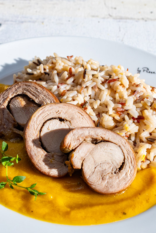 Na výpeku osmahneme cibuli, přidáme připravenou kořenovou zeleninu a směs opékáme ještě cca 2 minuty. Následně vrátíme maso do hrnce, přidáme bobkový list, nové koření a tymián a dochutíme solí a pepřem. V závěru vše podlijeme horkou vodou tak, aby maso bylo zcela ponořené a přivedeme k varu. Takto dusíme asi 50 minut dokud krůtí rolky nezměknou.