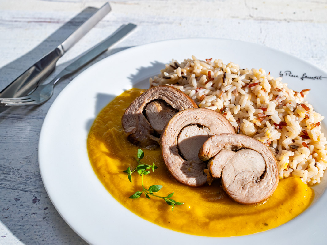 Hotové maso nakrájíme na plátky a servírujeme s omáčkou a divokou rýží.