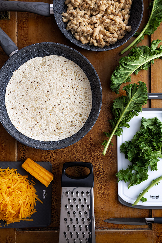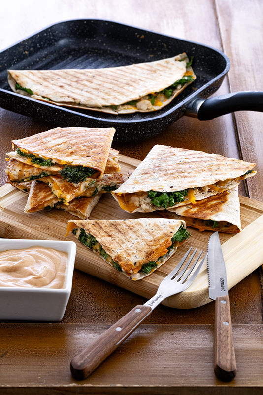 Tortilly potřeme zlehka vodou a rozpečeme bez oleje na pánvi, z každé strany cca půl minuty. Pak dáme prohřátou tortillu na jinou horkou pánev s trochou oleje, polovinu posypeme částí sýra, potřeme fazolovou směsi, navrch položíme kousky kadeřávku, a ještě přisypeme trochou sýra. Tortillu přehneme přes náplň, přitiskneme a opékáme z každé strany 1–2 minuty dozlatova, potom ji přeneseme na prkénko a nakrájíme na čtvrtiny.
