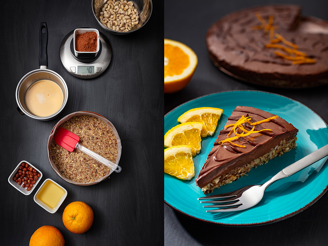Kešu oříšky zalijeme 200ml vody a necháme nejméně 3 hodiny stát. Všechny suroviny na korpus rozmi×ujeme tyčovým mi×érem a ke konci přidáme 3 lžíce vlažné vody, aby vše spojilo. Tuto směs vtlačíme do koláčové formy o průměru 24 cm, vyložené papírem na pečení a dáme na chvíli do lednice. Ve vodní lázní si rozpustíme kokosový tuk, kakaové máslo a med, pokud není tekutý. Nyní do mi×éru vsypeme kešu i s vodou, ve které byly namočené, pak přidáme směs rozpuštěných tuků a medu a nakonec kakao, kůru a šťávu z obou pomerančů. Rozmi×ujeme všechno na jemný krém a nalijeme na vychlazený připravený korpus. Pokud chceme dortík ozdobit, asi 100 ml krému ponecháme v mi×éru, přidáme k němu lžíci kakaa a rozmi×ujeme, nalijeme spiralovitě na dort a špejlí vytvoříme pavučinu. Dortík uložíme do lednice a necháme ztuhnout nejlépe přes celou noc. Krájíme jej nožem namočeným v horké vodě, abychom nerozlamali polevu.