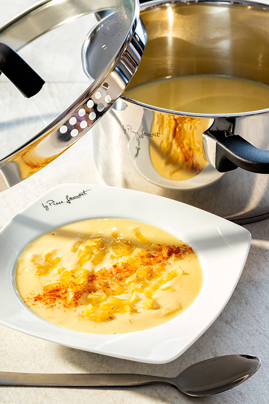 Oloupeme a nahrubo nasekáme cibuli. Špetku soli najemno rozetřeme v hnoždiři se šafránem a smícháme se 2 lžícemi vody. Cibuli zesklovatíme na olivovém oleje, posypeme moučkovým cukrem, necháme lehce zkaramelizovat a zalijeme bílým vínem. Přidáme zeleninový vývar a bobkové listy a přivedeme k varu. Necháme na mírném plameni 35 minut probublávat pod pokličkou. Po cca 20 minutách přidáme šafránovou směs. Odstraníme bobkové listy a z polevky vyjmeme cca 2 polévkové lžíce cibule. Polévku rozmi×ujeme dohladka, přidáme smetanu a odebranou cibuli. Polévku zahřejeme a ochutíme solí, bílým pepřem a kajenským pepřem. Rozdělíme do nahřátých misek, pokapeme troškou olejem z vlašských ořechů a ihned podáváme.