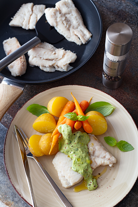 Každý filet potřeme 1 lžičkou mořské soli a odložíme. Brambory dáme do velkého hrnce, velké rozpůlíme a přelijeme vroucí osolenou vodou z rychlovarné konvice tak, aby byly lehce překryté. Vaříme je na středním ohni 10 minut, pote přidáme mrkvičky. Rybí filety opláchneme, osušíme papírovou utěrkou a položíme kůží nahoru v cedníku vytřeném olejem. Cednik s rybou dáme do hrnce s bramborami a mrkvičkami tak, aby se voda nedostala do cedniku. Hrnec přiklopíme a vaříme 10 minut nebo dokud nejsou mrkvičky uvařené a rybí maso se nerozdeluje na šupinky. Mezitím otrháme lístky bazalky do hmoždiře, přitom několik hezkých listu odložíme na zdobení. Bazalku rozemeleme a nakonec vmícháme česnekovou majonézu. Před podáváním odstraníme z filetů kůži a maso rozdělíme na talíře. Brambory s mrkvičkami scedíme, přidáme k rybám a na každý talíř dáme pěkný kopeček bazalkové majonézy, ozdobíme lístky bazalky, opepříme a pokapeme extra panenským olivovým olejem.
