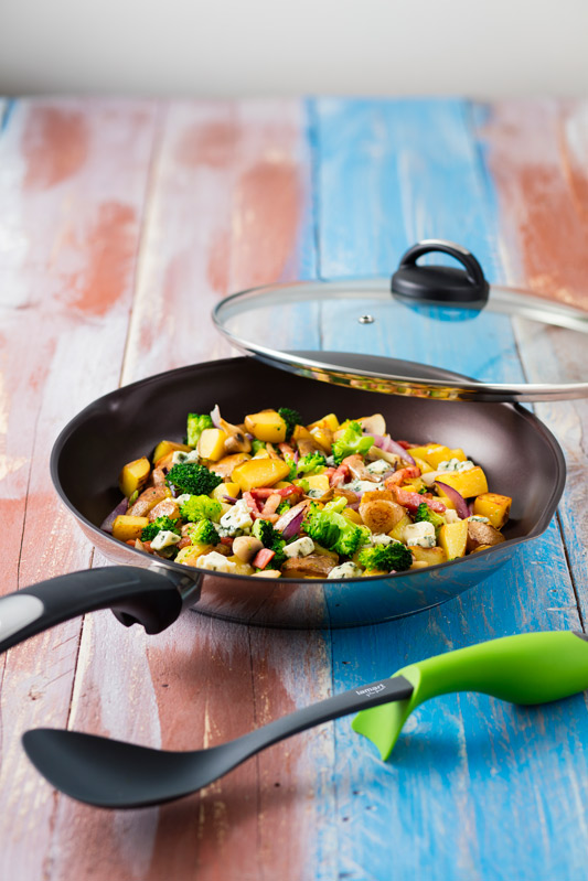 Restované brambory s brokolicí, žampióny, venkovskou slaninou a