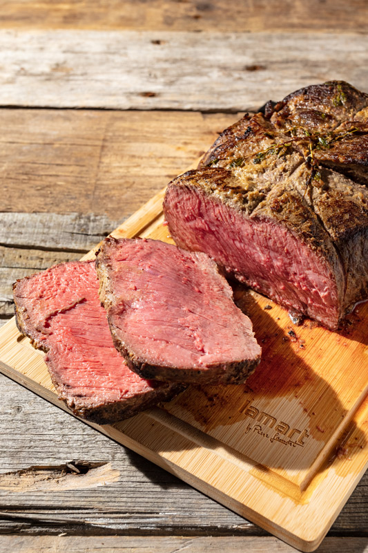 Po upečení rostbíf ostrým nožem krájíme na tenké plátky