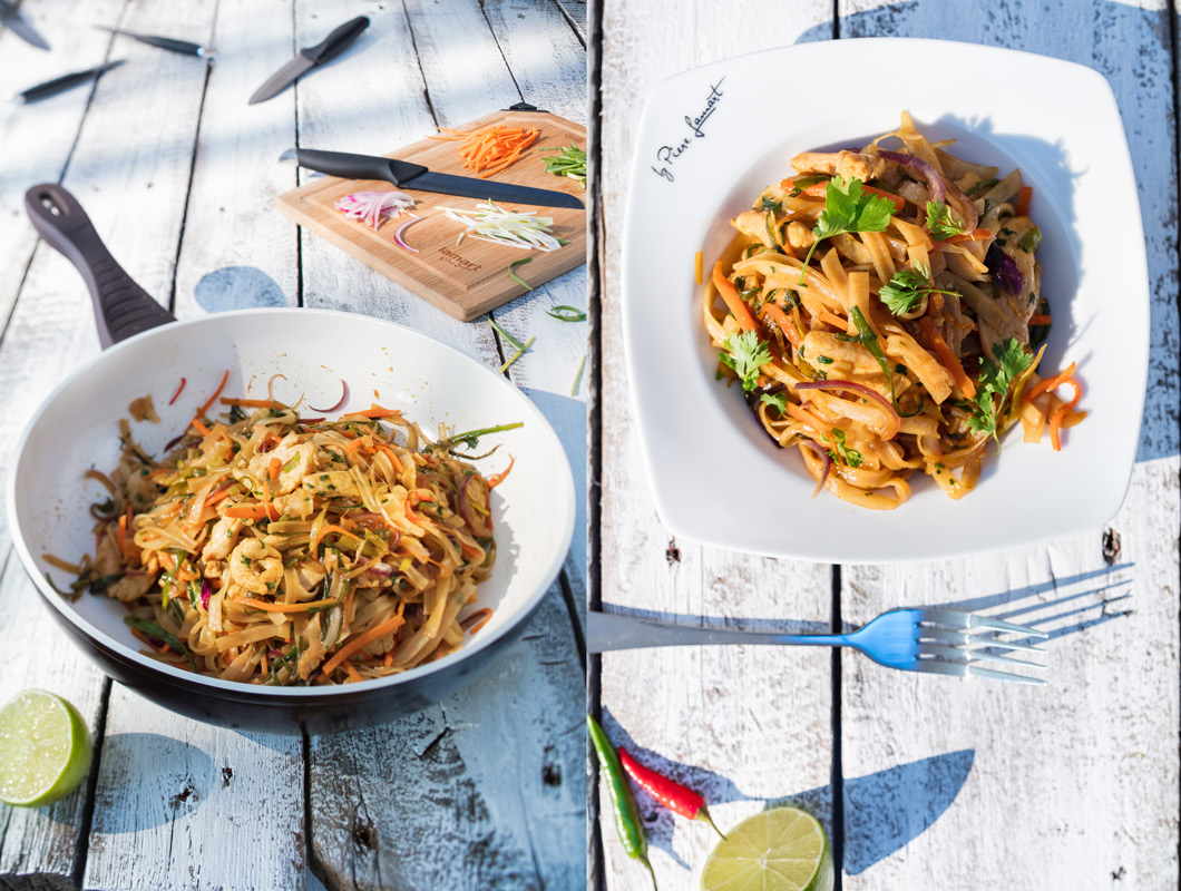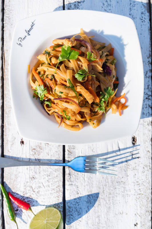 Pikantní asijské rýžové nudle s kuřecím masem, zeleninou a koriandrem