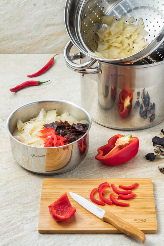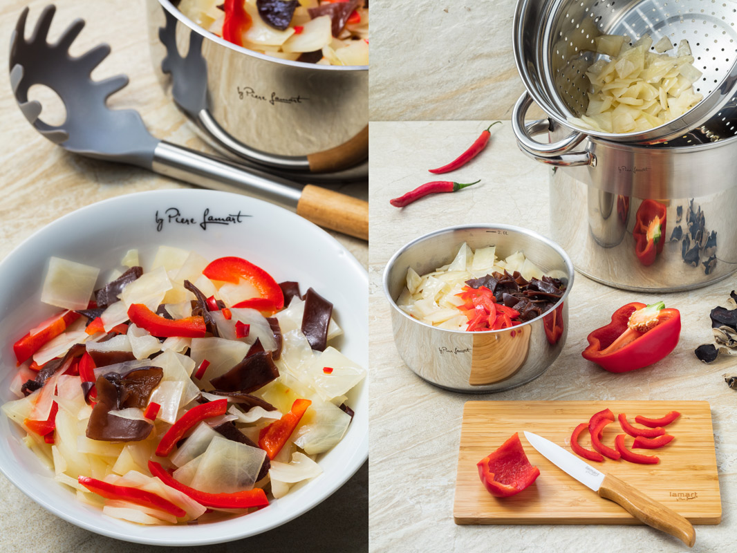 - Místo sterilované kapie můžeme dát syrovou červenou papriku, kterou nakrájíme na tenké proužky a přimícháme do horkého spařeného zelí společně s octem a cukrem a houbami.