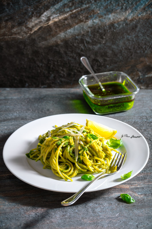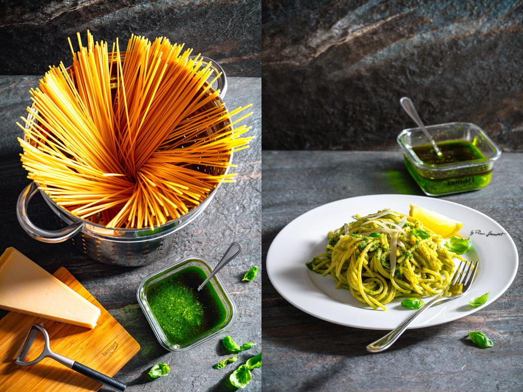 Lístky bazalky, nasekaný česnek, ořechy a nastrouhaný parmazán pomocí tyčového mixéru rozmixujeme, přidáme olivový olej, vymačkaný citrón, osolíme a opepříme a vymixujeme do hladka.